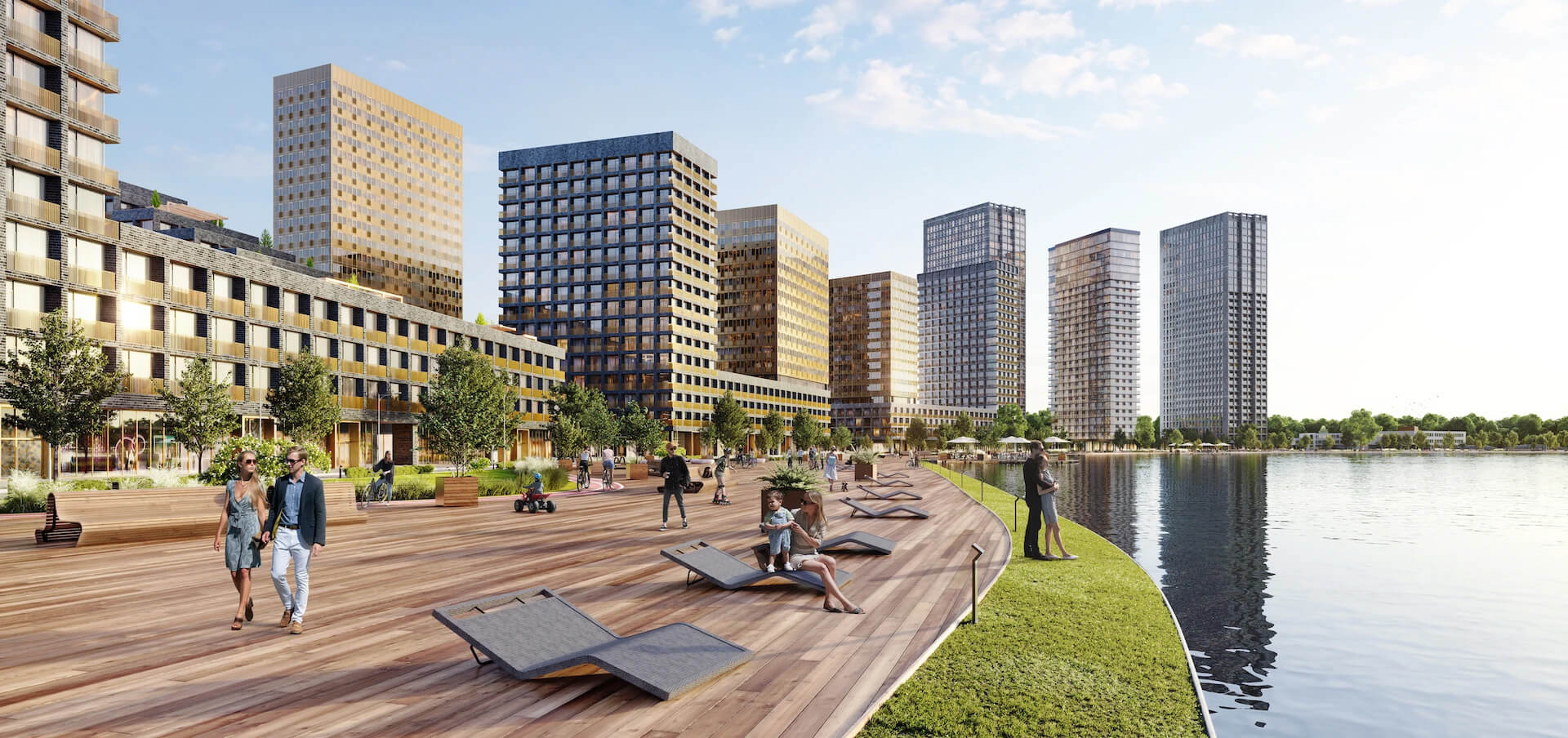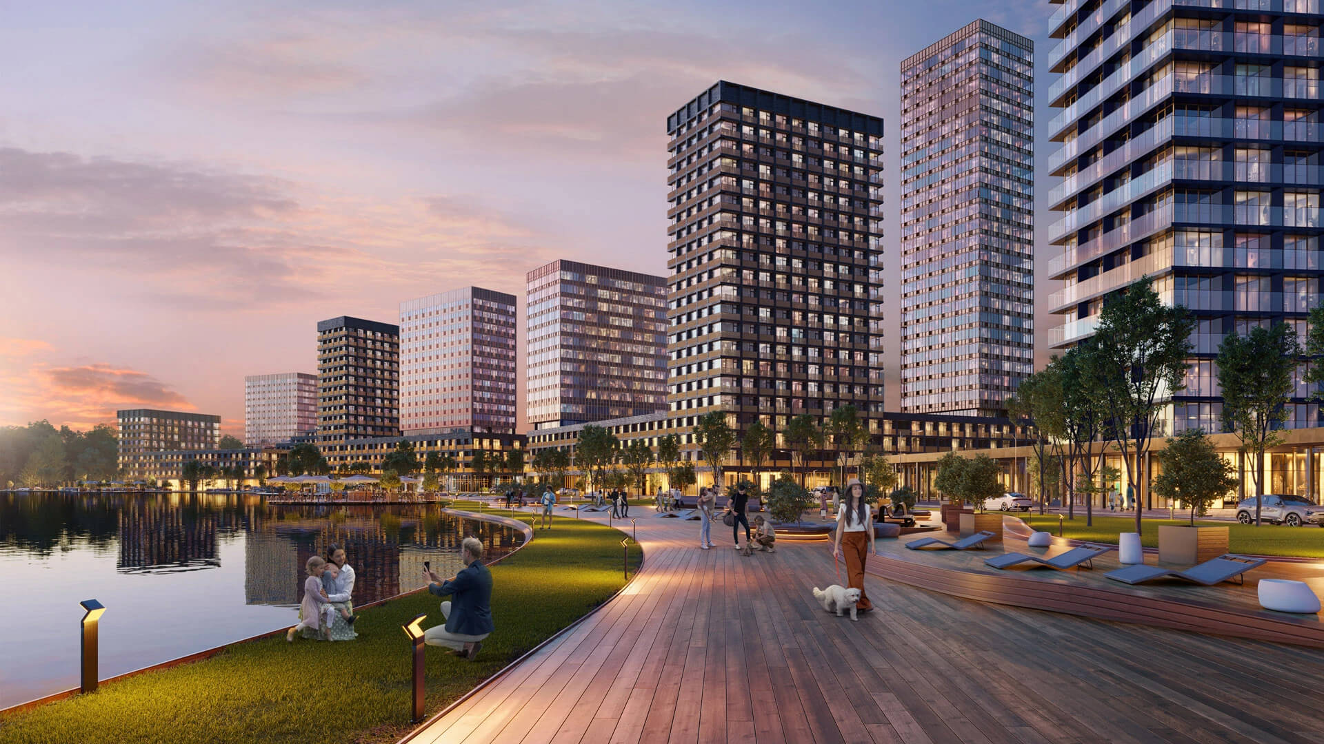 В ансамбле предусмотрены корпуса различной этажности, что создаёт живую городскую панораму и позволяет открывать виды на воду и зеленую инфраструктуру почти из каждой квартиры. Нижние этажи формируют активный уличный фронт с коммерческими пространствами и просторными входными группами. Архитектура здесь не только эстетична, но и функциональна: продуманная инсоляция, грамотное зонирование, продольная ориентация домов по берегу обеспечивают комфортный микроклимат и приватность для жильцов. В каждом корпусе предусмотрены современные инженерные решения: бесшумные лифты, дизайнерские холлы, тёплые лоджии и террасы.